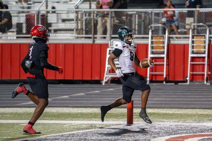 Waxahachie senior receiver Kohen Brown trots into the end zone for one of his three touchdowns during Friday night's District 11-6A game in Cedar Hill. Brown finished the night with 171 receiving yards in a 35-0 shutout victory. Photo Credit: Kirk Holt / Daily Light photojournalist